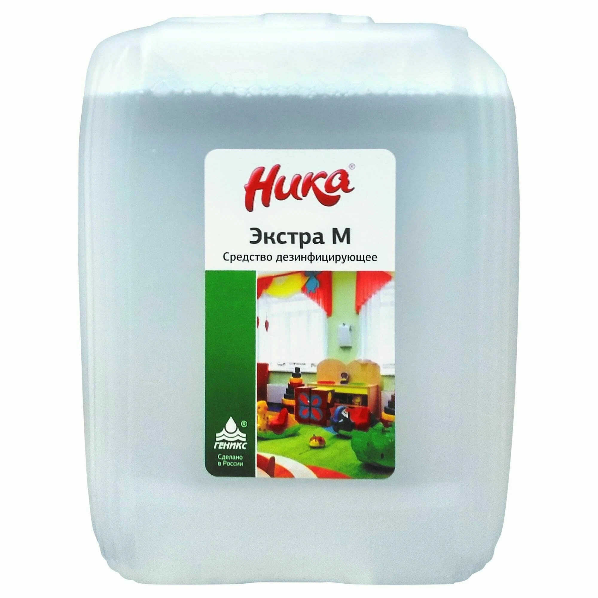 Дезинфицирующее средство «Ника-Экстра М» объёмом — это прозрачная бесцветная жидкость со слабым приятным запахом. Назначение: дезинфекция, мытьё поверхностей в помещениях, жёсткой мебели, санитарно-технического оборудования, белья, посуды, предметов ухода за больными, уборочного инвентаря при проведении профилактической, текущей и генеральной уборок в ЛПУ, детских учреждениях, на предприятиях общественного питания, коммунальных объектах, объектах железнодорожного транспорта и воздушных судов гражданской авиации; использование населением в быту. Также подходит для предстерилизационной очистки изделий медицинского назначения (включая стоматологические инструменты, жёсткие и гибкие эндоскопы и инструменты к ним) в лечебно-профилактических учреждениях. Состав: алкилдиметилбензиламмоний хлорид (ЧАС) — 3,5–4,5% и другие компоненты, обеспечивающие моющее действие. Объем- 5 л.