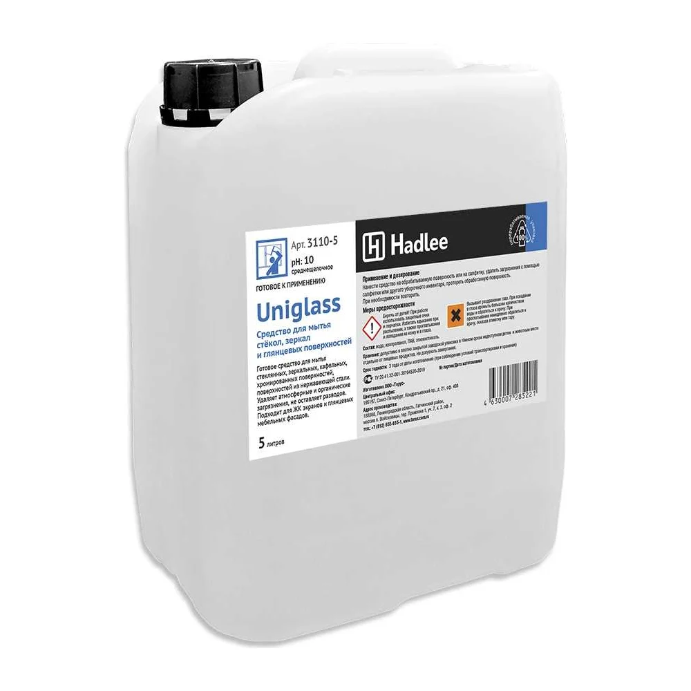 HADLEE Uniglass — готовое к применению средство для мытья стёкол, зеркал, хрусталя, оргстекла, поликарбоната и других пластиков, керамики, камня, нержавеющей стали, деревянных и других поверхностей. Описание: удаляет улично-бытовые, лёгкие жировые и другие загрязнения, в том числе никотиновые смолы и остатки насекомых; не оставляет разводов; эффективно против застарелых атмосферных загрязнений; подходит для ЖК-экранов и глянцевых мебельных фасадов; придаёт антистатические свойства поверхности, что позволяет сохранить чистоту надолго; имеет лёгкий спиртовой запах, который быстро выветривается. Состав: вода, ИПС, краситель, нПАВ, сополимер акриловый, отдушка. Объем- 5 л.