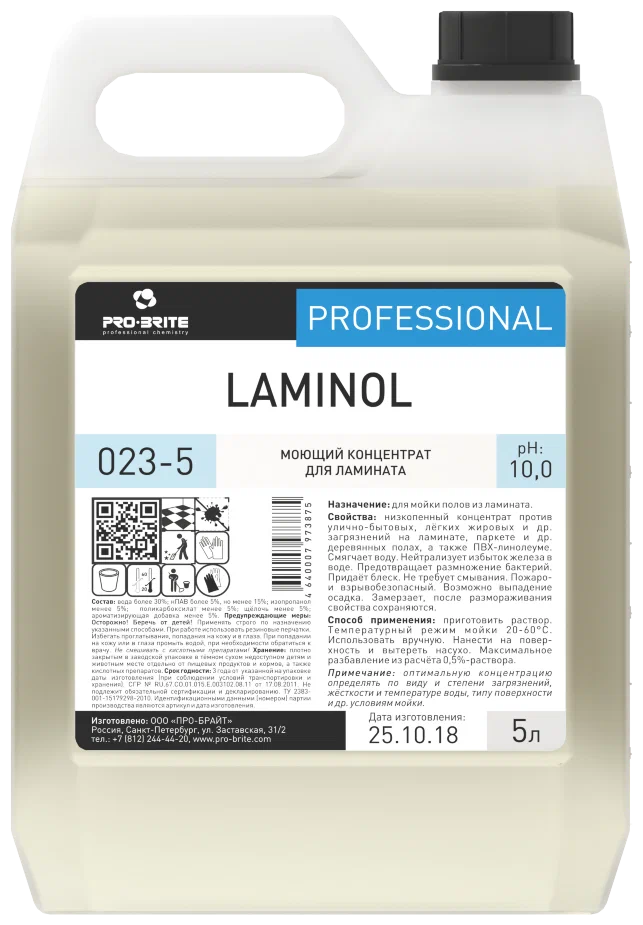 Жидкий концентрат против улично-бытовых, лёгких жировых и др. загрязнений на ламинате, паркете и др. деревянных полах, а также ПВХ-линолеуме. Смягчает воду. Нейтрализует избыток железа в воде. Предотвращает размножение бактерий. Придаёт блеск. Не требует смывания. pH-9,5 %. Объем- 5 л.