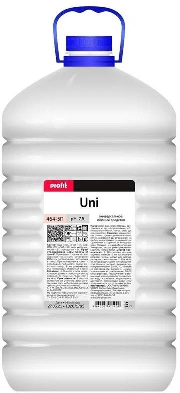 PROFIT UNI — универсальное щелочное пенное моющее средство, предназначенное для мытья посуды, сантехнического оборудования, плитки, полов, стен и иных влагостойких поверхностей. Описание: жидкий нейтральный концентрат без запаха против улично-бытовых, лёгких жировых и других загрязнений на любых водостойких поверхностях. Применим в горячей и холодной воде. Пожаро- и взрывобезопасный. Замерзает, после размораживания свойства сохраняются. Состав: вода >30%, аПАВ <5%, нПАВ <5%, амф.ПАВ <5%, соль неорганическая <5%, консервант <5%. Объем- 5 л.