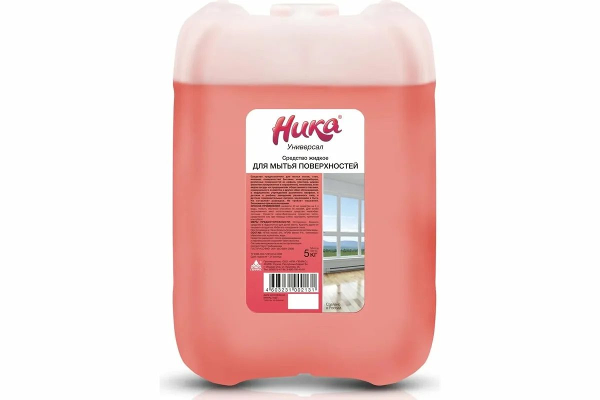 Средство моющее универсальное 1 кг «Ника „Универсал“», жидкое предназначено для мытья полов, стен, внешних поверхностей бытовых электроприборов, всех видов посуды, различных поверхностей из кафеля, пластика, дерева на предприятиях общественного питания и других сфер обслуживания, а также в быту. Некоторые особенности: обладает хорошим обезжиривающим и моющим действием; удаляет масложировые загрязнения, пыль, грязь, сажу, придавая поверхности свежий вид; эффективно в воде любой жёсткости и температуры; не оставляет разводов при высыхании; не нарушает защитных покрытий на поверхностях; не разлагается с выделением вредных веществ; замерзает, и после размораживания все свойства сохраняются. Состав: НПАВ менее 5%, АПАВ менее 5%, комплексообразователь, краситель, вода. Объем- 5 л.