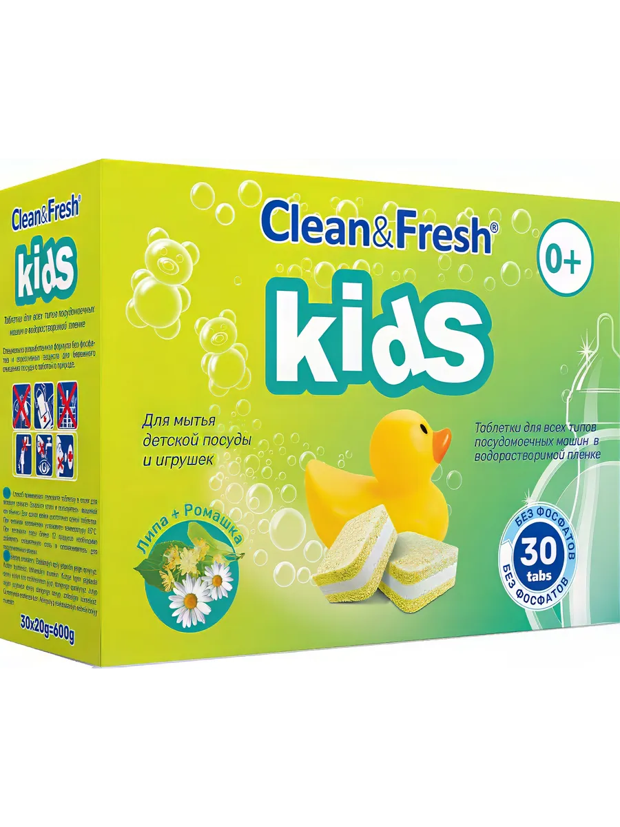 Таблетки для посудомоечных машин Clean&Fresh KIDS предназначены для мытья детской посуды. Описание: удаляют все загрязнения и устраняют неприятные запахи; после мойки на посуде остаётся лёгкий аромат лимона; придают блеск и сияние посуде; бережно заботятся о посуде из стекла и хрусталя, не допуская её потемнения; помогают усилить блеск посуды из нержавеющей стали; содержат смягчающие воду добавки и защищают посудомоечную машину от образования накипи; сохраняют свою эффективность при температуре воды 30 °С, способствуя более экономному расходу электричества при мойке посуды. Состав: экстракты липы и ромашки, лимонная кислота 15–30%, сода пищевая 15–30%, натуральное мыло, кислородный отбеливатель 5–15%, ферменты, соль поваренная, активные функциональные добавки. Количество- 30 шт.