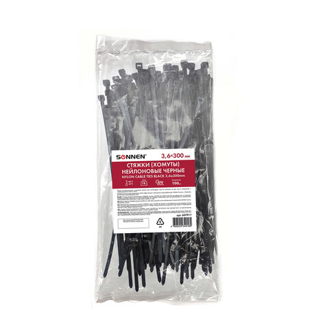 Стяжка (хомут) нейлоновая сверхпрочная POWER LOCK, 3,6x300 мм, комплект 100 шт., чёрная, SONNEN — это эластичная полоска из нейлона высокой прочности (PA 6.6) с замком на конце.