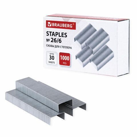Скобы BRAUBERG № 26/6 (для степлеров 24/6), 1000 штук, экономичные, до 30 листов