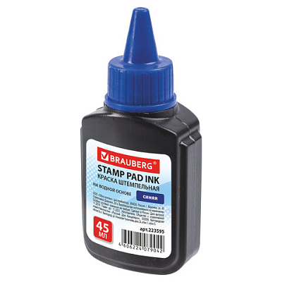 Штемпельная краска BRAUBERG предназначена для заправки штемпельных подушек, используемых для всех видов ручных и автоматических оснасток печатей, штампов, нумераторов и датеров. Оттиск штампа можно наносить на все виды бумаги, кроме глянцевой. Высококачественные чернила синего цвета на водной основе. Время высыхания оттиска – 30 секунд. Удобный пластиковый флакон с дозатором. Объем – 45 мл.