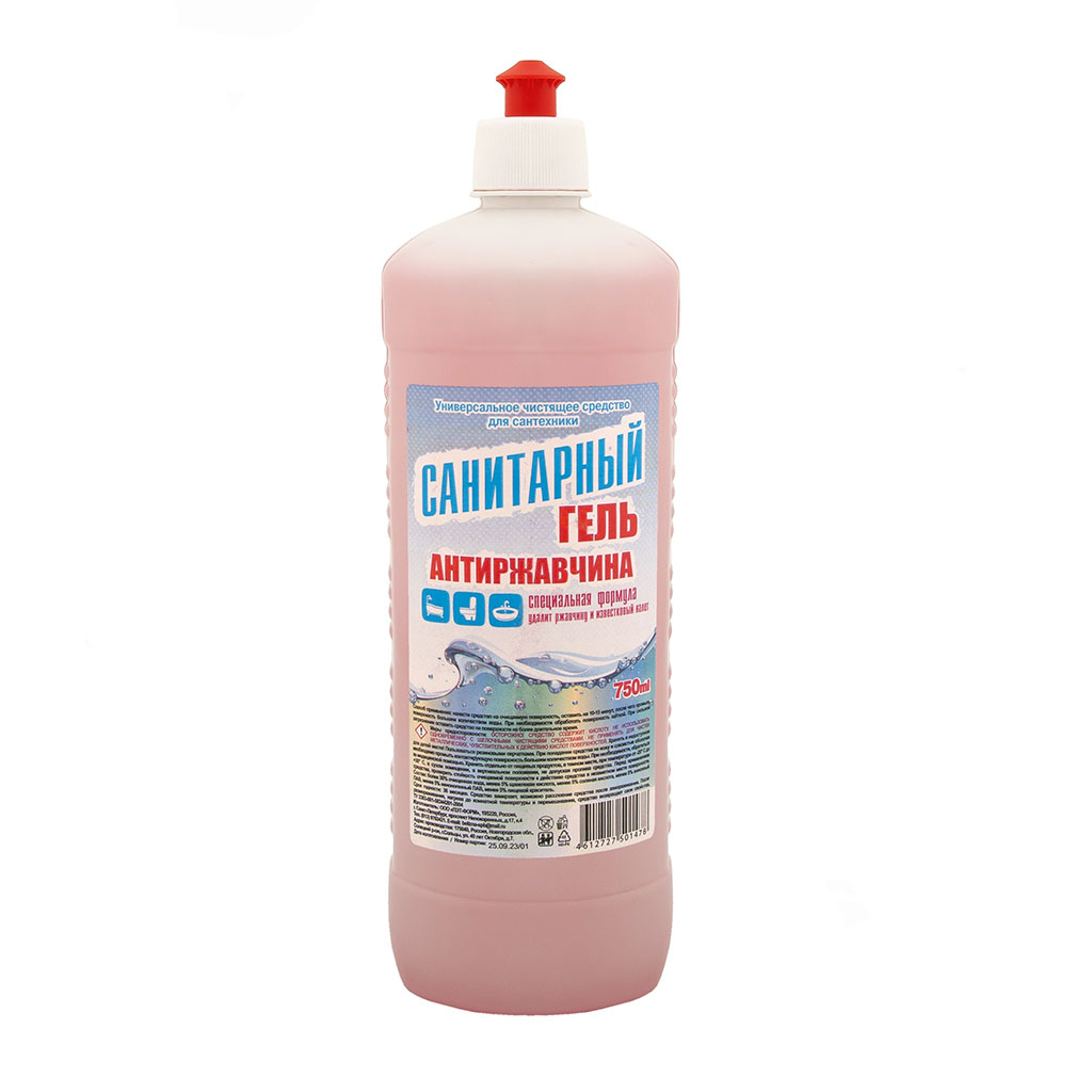 Чистящее средство для сантехники «САНИТАРНЫЙ Антиржавчина» — это универсальное средство для удаления ржавчины и известкового налёта. Подходит для чистки сантехники, профилактики засоров в канализационных трубах, мытья керамической плитки, любых твёрдых моющихся напольных покрытий, настенных панелей. Состав: 30% и более — очищенная вода, более 5%, но менее 15% — щавелевая кислота, менее 5% — анионный ПАВ, менее 5% — неионогенный ПАВ, менее 5% — пищевой краситель. Объем-750 мл.