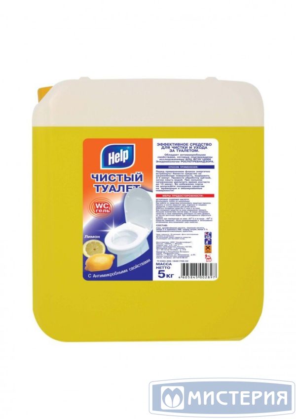 Гель «Чистый туалет» «Help» «Лимон» 5 л — это средство для чистки и ухода за туалетом. Обладает антимикробными свойствами. Состав: вода ≥30%, <5%: АПАВ, хлорид натрия, ортофосфорная кислота, лимонная кислота, отдушка, краситель. Объем- 5 л.