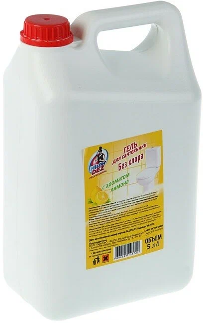 Гель Mister Dez PROFESSIONAL с ароматом лимона (без хлора), кислотный, против налёта и ржавчины — экологичное средство для чистки сантехники, хромированных, фаянсовых, акриловых, фарфоровых и керамических поверхностей. Описание:подходит для очистки акриловых, фаянсовых, хромированных, фарфоровых, керамических и других поверхностей; быстро и эффективно устраняет ржавчину, известковый налёт, минеральные отложения, грязь, мыльные разводы, плесень и грибок; устраняет ржавчину эффективнее обычных моющих средств; густая активная формула экономична в использовании; удобный практичный флакон обеспечивает тщательное покрытие; крышка с защитой от детей. Состав: 30% и более вода; 5% или более, но не менее 15% алкилбензосульфокислота, щавелевая кислота; менее 5% ортофосфорная кислота, отдушка, Cl 19140. Объём- 5 л.
