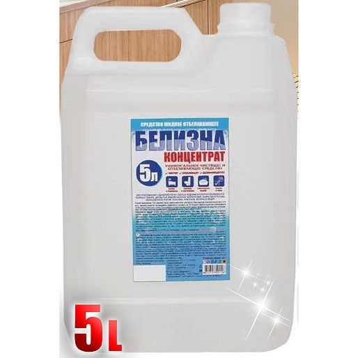 Отбеливатель-концентрат «Белизна» — это жидкое средство на основе активного хлора. Назначение: для отбеливания хлопчатобумажных и льняных тканей; для мойки и дезинфекции сантехнического оборудования, мусорных вёдер, полов, стен, поверхностей из керамической и кафельной плитки, фарфоровой, фаянсовой и пластиковой посуды ;для дезодорации канализационных сливов и водостоков. Состав: вода очищенная (более 30%), гипохлорит натрия (от 5 до 15%), едкий натр (менее 5%), комплексообразователь (менее 5%). Объем-5 л.