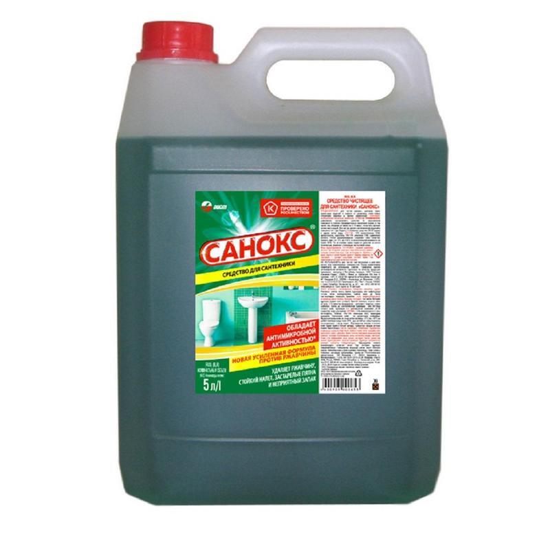Чистящее средство для сантехники «Санокс» предназначено для глубокой очистки раковин, унитазов, ванн, другого оборудования санузлов и ванных комнат, для мытья кафеля, стен и полов. Описание: эффективно удаляет ржавчину, мыльный осадок, жир, глубоко въевшуюся грязь, застарелые солевые отложения и известковый налёт, уничтожает возбудителей инфекций и неприятные запахи. Состав: <5% неионогенные ПАВ, ароматизатор, краситель; 5–15% анионные ПАВ, щавелевая кислота. Объем- 5 л.