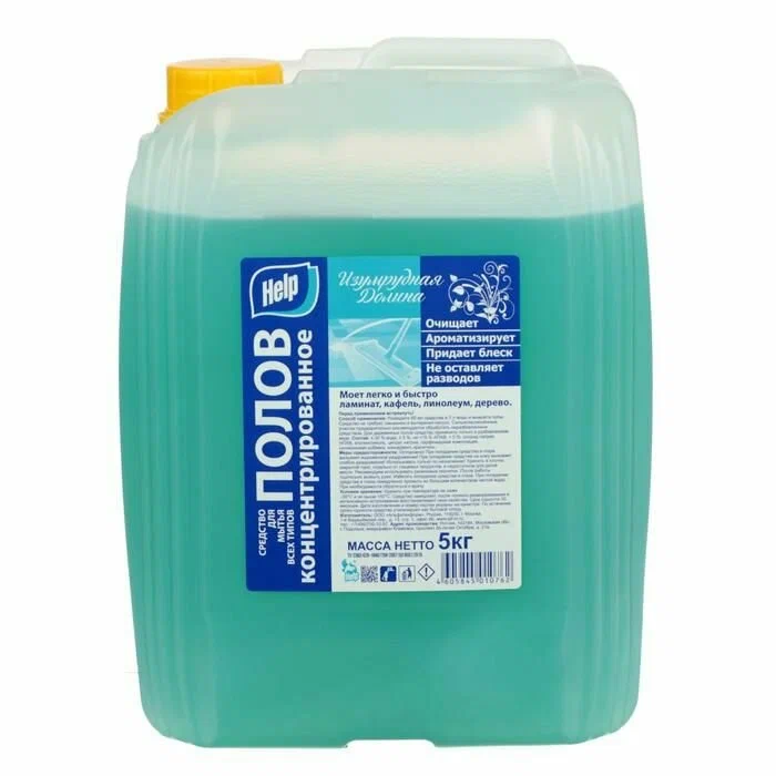 Средство для мытья полов концентрированное «Help» «Изумрудная долина» описание: очищает, ароматизирует, придаёт блеск, не оставляет разводов. Легко и быстро моет ламинат, кафель, линолеум, дерево. Состав: 30% вода, 5% АПАВ, 5% хлорид натрия, НПАВ, этиленгликоль, цитрат натрия, парфюмерная композиция, силиконовая добавка, консервант, краситель. Объем-5 л.
