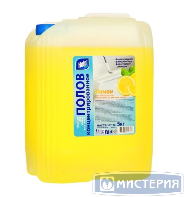 Концентрированное средство для мытья полов «Help» «Лимон» — универсальное средство для полов любого типа: ламинат, кафель, линолеум, дерево. Легко и быстро очищает и моет пол, эффективно удаляет самые стойкие и сложные загрязнения, не разрушая при этом очищаемые поверхности. Состав: 30% вода, 5%, но < 15% АПАВ, < 5% НПАВ, < 5% хлорид натрия, < 5% этиленгликоль, < 5% цитрат натрия, < 5% консервант, < 5% парфюмерная композиция (лимонен, линалоол), < 5% пеногаситель (силикон), < 5% краситель. Объем- 5 л.