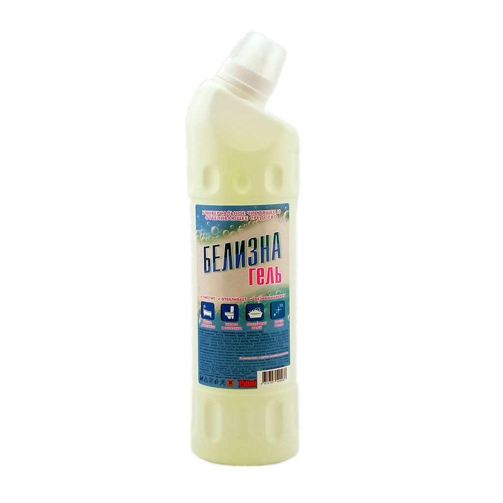 «Белизна-гель» — универсальное чистящее и отбеливающее средство. Предназначено для чистки предметов санитарно-бытового назначения, а также отбеливания тканей. Состав: вода очищенная > 30%, гипохлорит натрия от 5 до 15%, едкий натр < 5%, комплексообразователь < 5%. Назначение: для отбеливания хлопчатобумажных и льняных тканей; для мойки и дезинфекции сантехнического оборудования, мусорных вёдер, полов, стен, поверхностей из керамической и кафельной плитки, фарфоровой, фаянсовой и пластиковой посуды; для дезодорации канализационных сливов и водостоков. Объем- 750 мл.