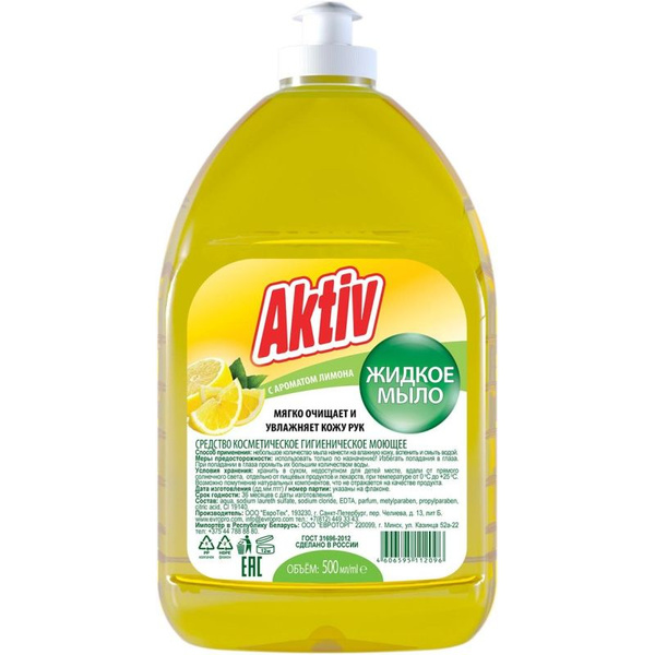 Жидкое мыло Aktiv «Лимон» предназначено для мытья рук и тела. Благодаря своему составу оно бережно очищает кожу, а аромат лимона придаёт мылу свежесть и приятный запах. Состав: Вода, лауретсульфат натрия, хлорид натрия, ЭДТА, отдушка, МЕТИЛПАРАБЕН, пропилпарабен, лимонная кислота, ci 19140. Объем- 500 мл.
