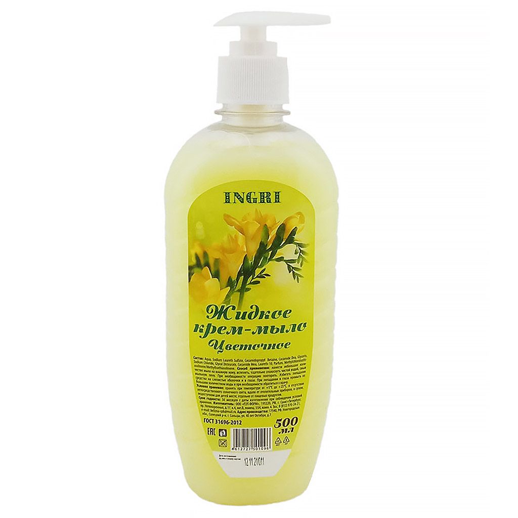 Жидкое крем-мыло «Цветочное» INGRI эффективно очищает и ухаживает за кожей рук, делая её мягкой. Состав: Вода, лауретсульфат натрия, Кокамидопропил Бетаин, Кокамид Дэа, Глицерин, Парфюмированная вода, Метилхлоризотиазолинон, Метилизотизотиазолинон. Объем- 500 мл.