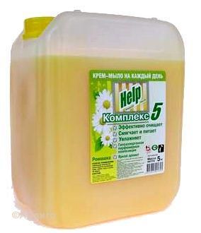 Жидкое мыло «Help» «Ромашка» — нежное средство для рук. Даёт устойчивую высокую пену, смывает любые загрязнения, в том числе животный и растительный жиры, машинные масла. Удаляет неприятные запахи, бережно ухаживает и увлажняет кожу рук. Состав: красители; консервант; натрия хлорид; диэтаноламид кокосового масла; вода очищенная; кокамидопропилбетаин; натрия лауретсульфат; парфюмерная композиция; триклозан; акрилатный сополимер. Объем- 5 л.