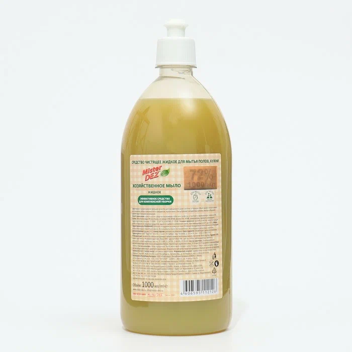 Жидкое хозяйственное мыло Mister Dez — универсальное моющее средство для влажной уборки различных поверхностей и предметов, пола и окон. Устраняет неприятные запахи, быстро и бережно удаляет грязь, жир и сильные загрязнения. Состав: более 30% вода, 5% или более, но менее 15% А-ПАВ, менее 5%: Н-ПАВ, замутнитель, трилон Б, консервант, гидроксид натрия, отдушка, красители CI 15985, CI 14720, CI 42090, CI 19140. Флакон оснащён насадкой пуш-пул, что позволяет легко дозировать необходимое количество средства. Объем- 1 л.