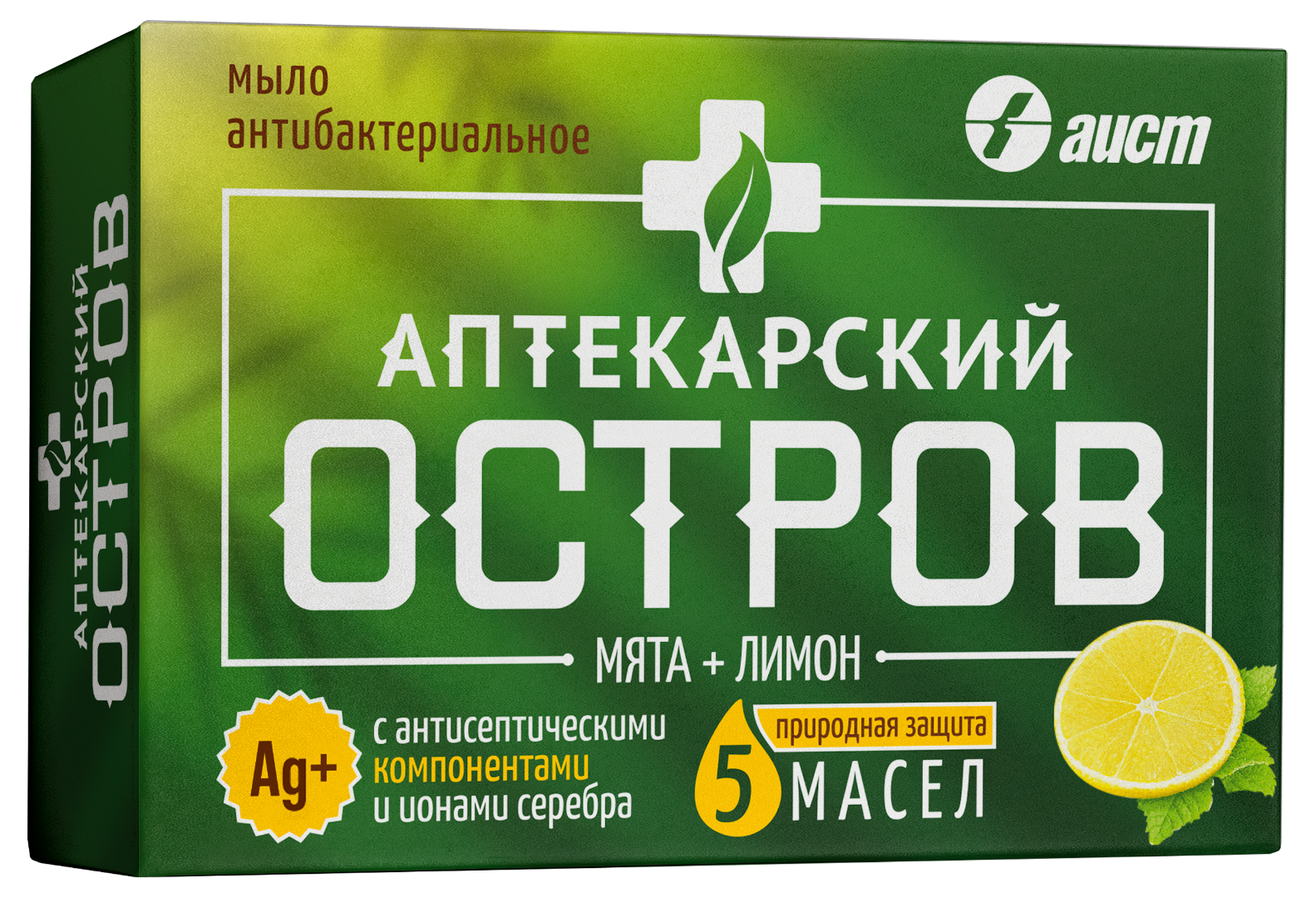 Туалетное твёрдое антибактериальное мыло «Экстра» «Аптекарский остров» с антисептическими компонентами и ионами серебра — «Мята и лимон» содержит натуральные эфирные масла мяты, апельсина, лимона и грейпфрута. Они обладают антисептическими, противогрибковыми, противовирусными регенерирующими и иммуноукрепляющими свойствами. В качестве дополнительного антисептического компонента мыло содержит цитрат серебра — природный бактерицид, обладающий противовоспалительным действием. Вес- 100 г.