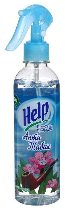 Освежитель воздуха «Help» «Антитабак» предназначен для устранения неприятных запахов и ароматизации воздуха в жилых помещениях и в салонах автомобилей, а также для ароматизации текстильных изделий и белья. Состав: >30% вода, <5% парфюмерная композиция, <5% НПАВ, <5% глицерин, <5% пропиленгликоль, <5% консервант. Объем- 345 мл.
