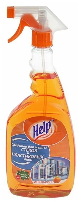 Средство для мытья стёкол «Апельсин» с распылителем от Help — универсальное средство для мытья оконного, автомобильного стекла, зеркал, экранов телевизоров, стеклянной посуды. Особенности: легко удаляет пыль, грязь, жир, следы от пальцев; придаёт блеск стеклянной поверхности; обладает антистатическим эффектом, благодаря чему стекло дольше остаётся чистым. Состав: вода, пропиленгликоль, красители, изопропанол, амфотерные ПАВ, парфюмерная композиция, тетранатрия ЭДТА. Объем- 750 мл.