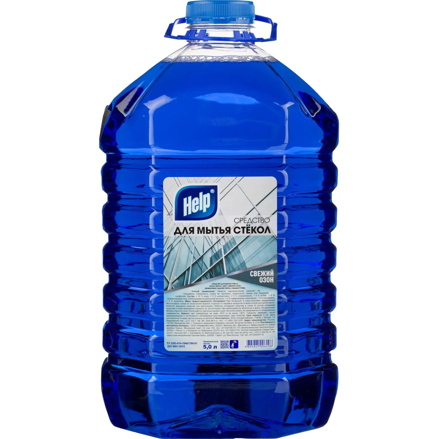 Средство для мытья стёкол и зеркал Help «Свежий озон» с распылителем предназначено для мытья оконных и автомобильных стёкол, витрин, зеркал, стёкол, кафеля, хрусталя, фарфора, фаянса, экранов телевизоров и мониторов. Состав: 5–15% растворители, в том числе изопропанол; 5% АПАВ; 5% парфюмерная композиция; 5% краситель. Объем- 5 л.