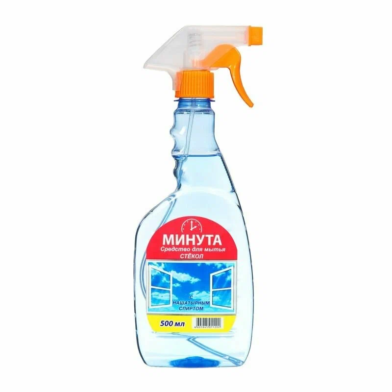 Средство для мытья стёкол «Минута» с нашатырным спиртом предназначено для очистки зеркальных и стеклянных поверхностей, таких как окна, витрины, автомобильные стёкла, хрусталь и зеркала. Состав: более 30% воды, 5–15% изопропанола, 5% этиленгликоля, 5% АПАВ, 5% парфюмерной композиции, 5% тетранатриевой соли этилендиаминтетрауксусной кислоты, 5% консерванта и 5% красителя. Объем- 500 мл.
