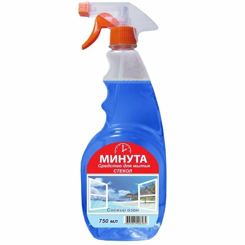 Средство для мытья стёкол и зеркал «Минута» «Свежий озон» — эффективное средство с водоотталкивающей системой для мытья стёкол, окон, зеркал без разводов. Удаляет пятна, смывает грязь, следы пальцев. Защищает от пыли и придаёт блеск. Не оставляет разводов. Состав: ≥30% вода, >5%, <15% изопропанол, <5% этиленгликоль, <5% АПАВ, <5% парфюмерная композиция, <5% тетранатриевая соль этилендиаминтетрауксусной кислоты, <5% консервант, <5% краситель. Объем- 750 мл.