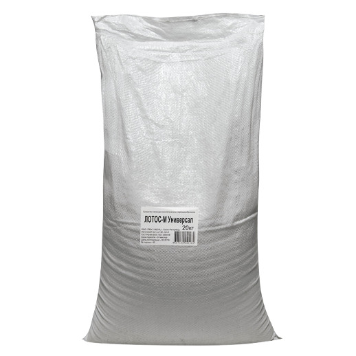 Стиральный порошок «Лотос-М Универсал» — синтетическое порошкообразное средство, предназначенное для стирки изделий из льняных, хлопчатобумажных и смешанных тканей в стиральных машинах активаторного типа, замачивания, ручной стирки, а также для влажной уборки помещений, мытья кафеля и пластика. Состав: сульфат натрия (30% и более), карбонат натрия (5% и более, но менее 15%), поверхностно-активные вещества (менее 5%), комплексообразователь (менее 5%), отдушка (менее 5%). Особенности: эффективно отстирывает въевшиеся загрязнения и застарелые пятна; не вызывает аллергию; без запаха; без фосфатов; без хлора. Вес- 20 кг.
