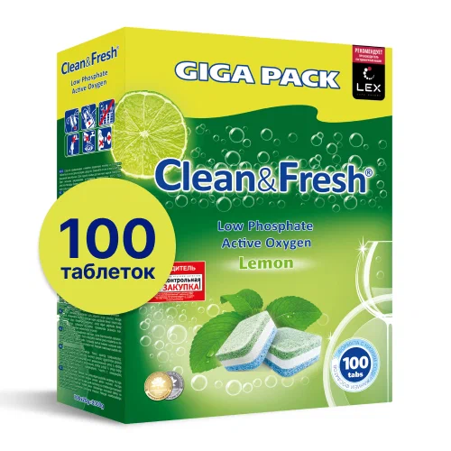 Таблетки для посудомоечных машин Clean&Fresh (20 г) способствуют лучшему результату мойки, удаляют даже сильные загрязнения. Достаточно поместить одну таблетку в дозатор посудомоечной машины, и посуда приобретает идеальную чистоту и свежесть, без разводов и известковых пятен. Состав: триполифосфат натрия — более 30%, карбонат натрия, бикарбонат натрия — 15–30%, перкарбонат натрия — 5–15%, силикат натрия, поликарбоксилаты, неионные ПАВ, ТАЕД, энзимы, фосфонаты, отдушка, краситель — менее 5%. Таблетки имеют несколько цветных слоёв: Зелёный — для лимонного запаха и защиты стекла от коррозии. Белый — для защиты посудомоечной машины от образования накипи и наслоений извести. Синий — для очистки с активным кислородом. Синие микро-жемчужины — для блестящей посуды и сияющего стекла. Количество -100 шт.