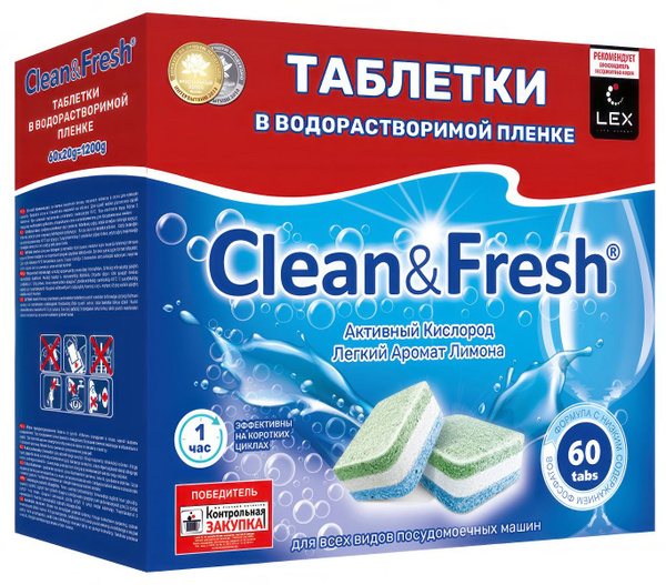 Таблетки для посудомоечных машин Clean&Fresh в водорастворимой плёнке обеспечивают безупречную чистоту посуды. Плёнка полностью растворяется в воде, поэтому перед применением таблетку не нужно распаковывать — достаточно положить её в отсек для моющего средства. Состав: 15–30% карбонат натрия, 15–30% кислородный отбеливатель, 15–30% триполифосфат натрия, <5% гидрокарбонат натрия, <5% неионогенные поверхностно активные вещества, лимонная кислота, энзимный комплекс, парфюм. Описание: таблетки обладают мощной формулой, удаляющей самые стойкие загрязнения, такие как остатки пищи, жиры и нагар. Таблетка постепенно растворяется во время цикла мойки, обеспечивая равномерное распределение активных веществ. Результат — абсолютно чистая и блестящая посуда, без неприятных запахов или разводов. В состав таблеток входят компоненты, защищающие посудомоечную машину от накипи и известковых отложений, что обеспечивает более длительный срок службы техники. Таблетки подходят для всех типов посудомоечных машин, эффективны даже на коротких и средних циклах. Безопасны в использовании и подходят для мытья детской посуды и игрушек. Количество -60 шт.