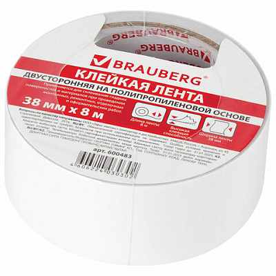 Клейкая двухсторонняя лента 38 мм х 8 м, ПОЛИПРОПИЛЕНОВАЯ ОСНОВА, 90 мкм, BRAUBERG