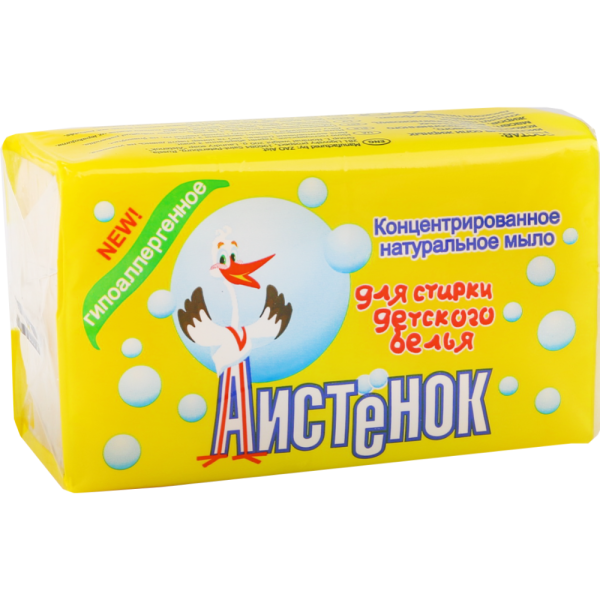 Твёрдое детское хозяйственное мыло «Аистёнок» предназначено для ручной стирки детской одежды. Это высококонцентрированное натуральное мыло, которому под силу любые загрязнения. В составе используются растительные масла и жиры высокого качества, растворяющие грязь. Мыло отлично пенится, полностью смывается водой, а входящий в состав глицерин помогает смягчить кожу рук во время стирки. Содержит специальные добавки для сохранения мягкости и цвета белья. Мыло является гипоаллергенным и не содержит отдушек. Подходит для детей с самого рождения.